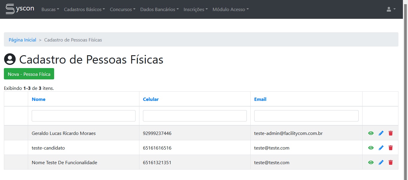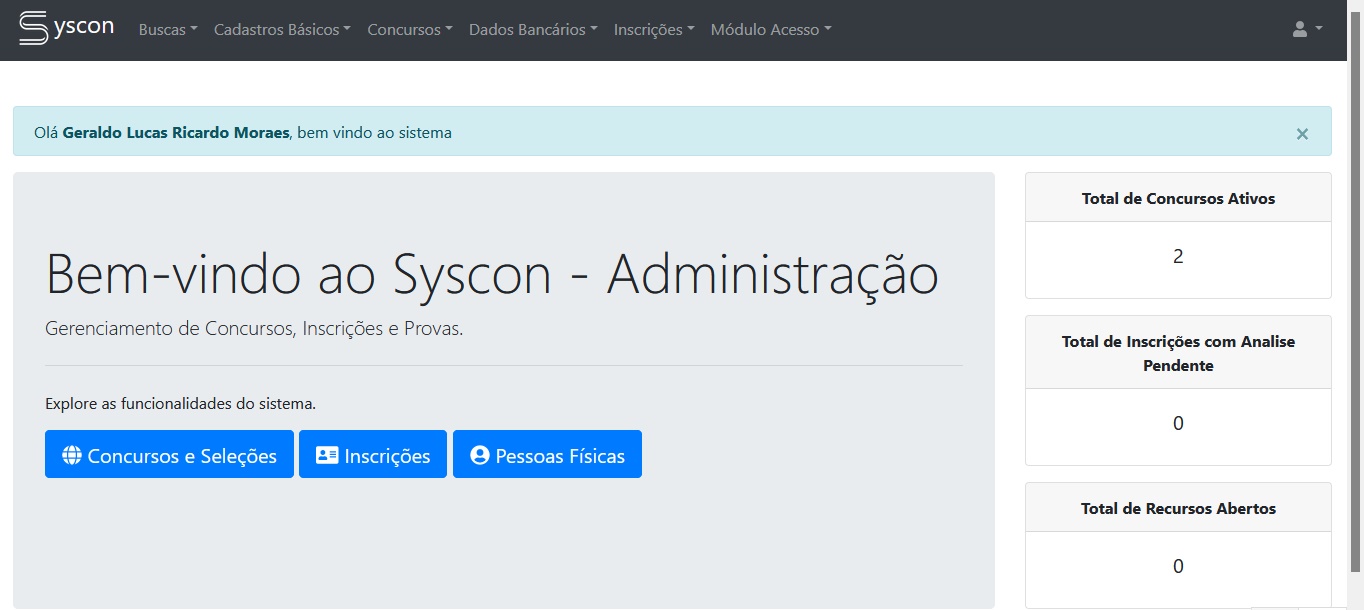 Área de acesso para os administradores, capaz de realizar cadastros de concursos, pessoas físicas, pessoa juridicas, locais de realização de provas, gerenciamento de pessoas e de concursos em geral.