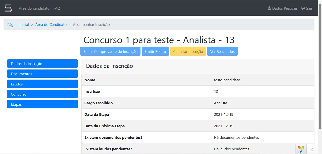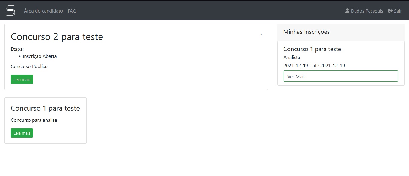Área de acesso para os candidatos, capaz de realizar inscrições em concursos, analisar o andamento do mesmo, armazenar o historico pessoal do candidato, possibilidade da criação de um perfil padrão e o acompanhamento das inscrições realizadas.